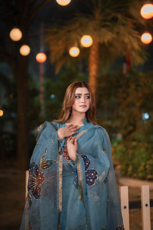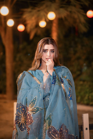 “Elegance Redefined: Embrace regal sophistication with our Raw Silk Royalty, adorned with the opulent charm of Organza. Each stitch is a testament to grace, weaving a tale of timeless allure and refined craftsmanship. Step into a world where elegance meets artistry, and every thread is a brushstroke painting—a masterpiece of style.” Fabric: Raw Silk Dupatta: Organza Handpainting with Embellished Four Sides Lace Shirt: Plain Rawsilk Material with stitching styles and designs Trouser: Pakistani Raw Silk