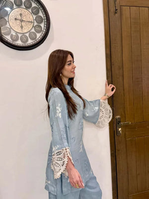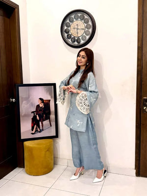 2-PC set raw silk embroidery with bail bottom trousers, shirt & Bell-Bottom trousers