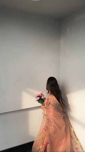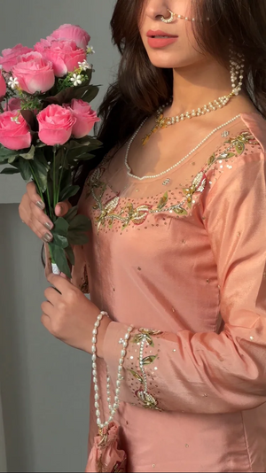 A fully Embellished On Neckline and , Paired with Handpainted Embellished Jacquard Organza Dupatta And Potli With Floral And Elaborate Naqshi Work With Pearls Details